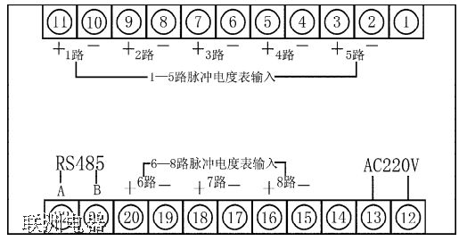 功能:能連接8路脈沖電度表的輸入,將電度數(shù)采集、存貯、變送至RS485總線,供上位計算機接收,能顯示8路電度量的累計數(shù)值、可設定初始值、斷電數(shù)據(jù)不丟失。
