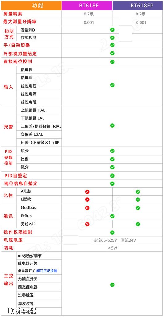 BT618F、BT618FP比例閥/直接閥位/閥門正反轉PID調節控制器支持比例閥、直接閥位閥門控制,支持外給定及手/自動切換輸出。采用智能PID調節控制,常用于流量、液位、壓力、濕度、溫度的測量與控制。主控輸出支持mA調節、交流接觸器控制、固態繼電器控制、可控硅過零/周波過零/移相觸發等。輸入可使用熱電偶、熱電阻、隔離配電器,如4-20mA、電磁流量計、壓力變送器輸等輸入。同時可以選3路輔助輸出;如報警、通訊、mA變送等。