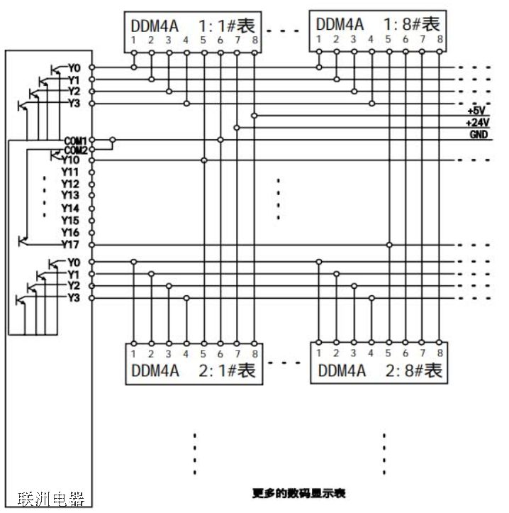 下圖為采用三菱FX系列PLC晶體管輸出模塊驅(qū)動(dòng)多塊顯示表接線示意。多表驅(qū)動(dòng)連接示意: