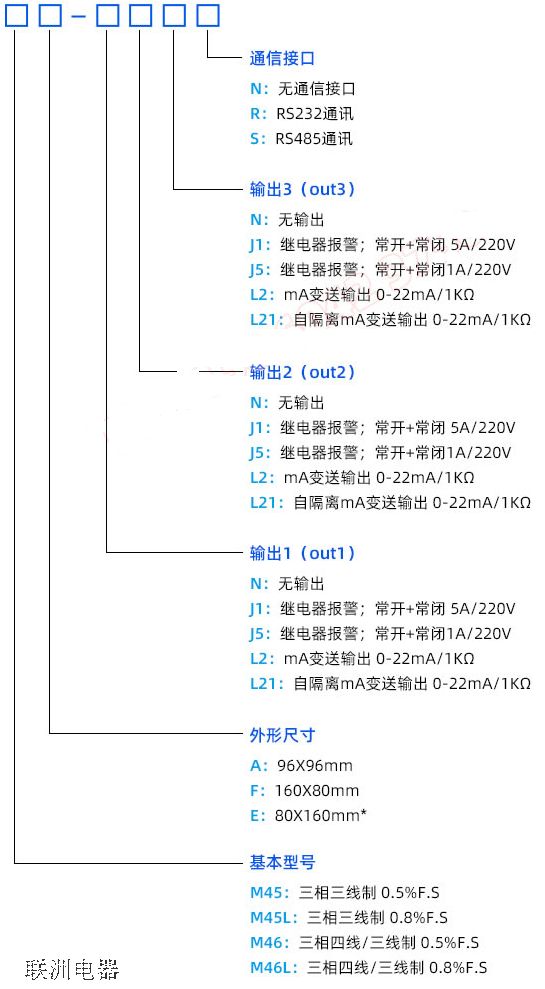 M45、M45L、M46、M46L系列三相電力表包含三相三線和四線制,可測量電壓、電流、頻率、有功功率、無功功率、功率因數、四象限電能(正負有功電能、正負無功電能),三排高亮數碼管自動循環顯示或手動切換顯示各測量值。具備1-3路報警開關量輸出或mA電流變送輸出,和Modbus標準通信協議。