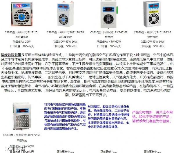 CS800、CS810、CS820、CS880配電柜除濕器 CS800、CS810、CS820、CS880系列的除濕器用于開關柜、配電柜、控制柜的除濕之用。這是一種排水弄除濕器,功率有大有小和相應的排水量。具體參數如下:看看視頻: Home > 配電柜 > 日期:2023-9-22 來源:www.cqlxgz.cn 發布:前前 閱讀: 上一篇:配電箱字母含義 圖紙中常見配電箱字母表示意思 下一篇:MTS-8030GY-32L、MTS-8060GY-32L電柜除濕器 配電箱安裝屬于什么工程 配電系統接地的設置 配電箱配置電器簡要說明 BCT系列電力配電用互感器 BCT系列電力配電用互感器 HBB-CS800電箱除濕器使用說明書.pdf 推薦 多功能電力儀表CPK-D3B的說明書HDZJ-130X 井蓋防盜系統行業國際形勢初學電工怎樣看懂電路圖 ZWN-G1(TH)智能溫度濕度控制器的產品概述接地電阻不準確的處理辦法和預防措施DH20G-100A電機保護器技術參數與使用S811R24N3S、S811R30N3S報價EVERQ6-320-6、QR75A1-I礦井風機起動裝置MZY1-5030、JJR2-200電動機晶閘管軟起R22空調內有空氣對空調有影響嗎 建議關注 消防泵啟動器MSKRQ1-S-7.5KP雙電源切換開關TLQ3-40排污泵啟動器JJ1-40KWATS雙電源開關BQ3-50A/4P智能雙電源自動轉換開關BJMQ8G-320/4PCB級雙電源轉換開關GFATS1-125/3PCBEPM-07電力網絡分析儀表雙電源切換開關W-N2/100A/4P(LCD)PZ211-1U1X1 數顯電壓表TH300VA-44離心風機軟啟動ADR5-45KW交直流電測儀表RC-EMP194Z-9HY水泵軟起動SNR5-400電力電容制造BSMJ0.42-20-1雙電源和雙回路切換裝置TKQG-800