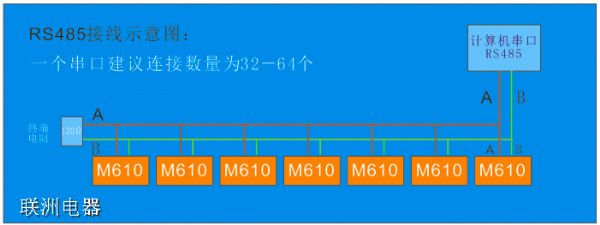 485接線其實非常簡單,你就當是串燈泡接線一樣給他們接起來就行,只不過你要注意的是它分A、B線,不可接錯,如下圖所示: