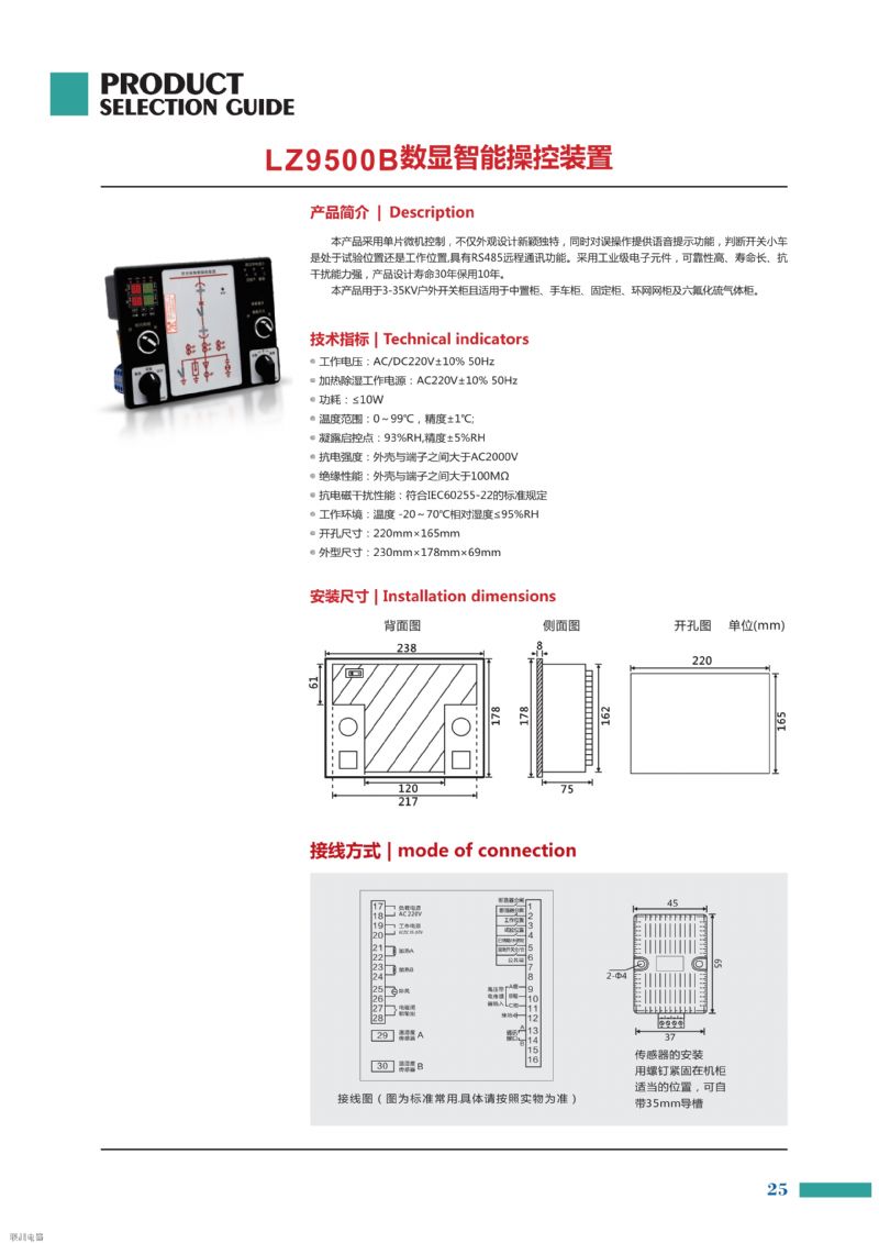 開關(guān)柜智能操控裝置是根據(jù)當(dāng)前中壓系統(tǒng)開關(guān)柜技術(shù)發(fā)展而設(shè)計(jì)開發(fā)的一種新型的模塊化、智能型的操作測(cè)量顯示裝置。產(chǎn)品集主回路模擬指示、帶電指示及閉鎖、驗(yàn)電功能、溫濕度數(shù)字實(shí)時(shí)顯示、自動(dòng)加熱除濕控制、自動(dòng)排風(fēng)降溫控制、斷路器分合閘狀態(tài)指示、儲(chǔ)能、接地開關(guān)指示、手車位置指示、智能防誤語(yǔ)音提示、人體感應(yīng)報(bào)警語(yǔ)音警示、回路電流、電壓、頻率、功率、電能、斷路器進(jìn)線出線母排溫度測(cè)量顯示、故障記錄查詢、時(shí)鐘指示、手動(dòng)自動(dòng)儲(chǔ)能選擇、遠(yuǎn)程就地切換、分閘合閘操作以及RS-485通訊接口等功能于一體。產(chǎn)品以一體化布局配套裝備于開關(guān)柜,將簡(jiǎn)化開關(guān)柜的面板結(jié)構(gòu)設(shè)計(jì),美化開關(guān)柜的面板布局,完善開關(guān)狀態(tài)的指示功能和安全性能。產(chǎn)品可用于3~40kV戶內(nèi)的開關(guān)柜,適用于中置柜、手車柜、固定柜、環(huán)網(wǎng)柜等多種開關(guān)柜。產(chǎn)品符合IEC255-22要求。DG-A01開關(guān)柜智能操控裝置的生產(chǎn)廠家是湖南聯(lián)洲電器