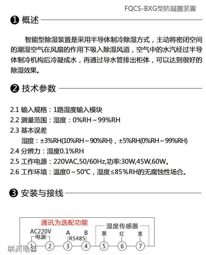 FQCS-BXG型防凝露裝置均是采用半導(dǎo)體冷凝技術(shù)的環(huán)保型除濕產(chǎn)品。半導(dǎo)體冷凝材料壽命長(zhǎng),環(huán)保無(wú)公害,低功耗,是一款新型的環(huán)保概念產(chǎn)品。本系列產(chǎn)品有別于傳統(tǒng)的加熱除濕方式,改變以往加熱除濕治標(biāo)不治本的做法,在不增大投資前提下,解決了電氣設(shè)備的潮濕問(wèn)題。智能除濕裝置是針對(duì)普通加熱型除濕器除濕效果差的缺點(diǎn)而開(kāi)發(fā)的箱體/柜體除濕換代產(chǎn)品。