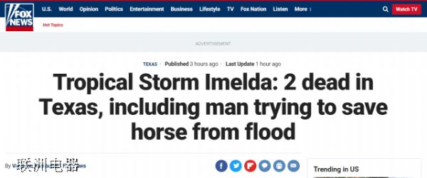 據美國福克斯新聞(Fox News)報道,2019年9月19日,受到熱帶風暴“伊梅爾達”(Imelda)影響,美國得克薩斯州遭暴雨襲擊,街道積水,一名男子因救自己的愛馬而觸電身亡。