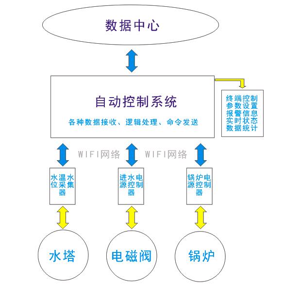 現場硬件將測量數據傳給后臺軟件系統,后臺系統記錄分析數據,并根據不同時段所設置的參數發送開關命令給硬件,硬件收到命令后開啟或關閉鍋爐、水泵、電磁閥等設備,從而控制水塔的液位、水溫,達到不同時段不同水位、溫度恒定的效果。