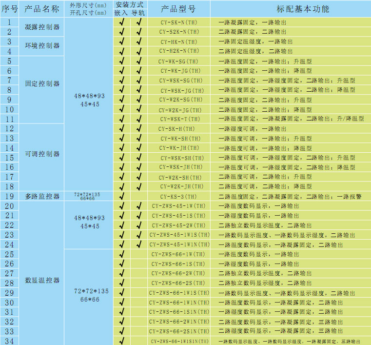 CY-ZWS-45和CY-ZWS-66溫濕度控制器型號產品外形尺寸主要是48*48和72*72兩種,具體型號有1路濕度的有1路溫度的,也有1路濕度1路溫度,具體型號意思如下: