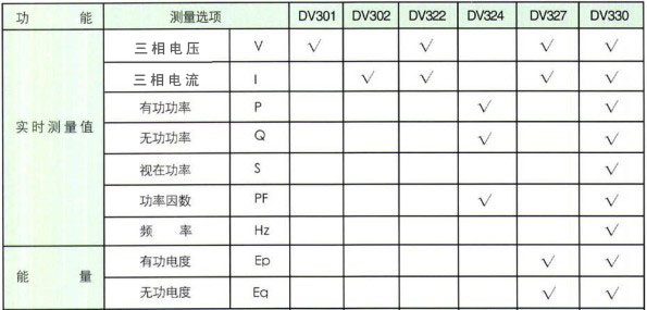 DV300系列三相多功能數字儀表用于配電系統的連續測量和監視。儀表可真有效值測量電壓、電流、有功功率、無功功率、視在功率、功率因數、頻率、有功電度、無功電度。具體型號有:DV301、DV302、DV322、DV324、DV327、DV330,它們的具體功能和區別請細看下文中的選型表。